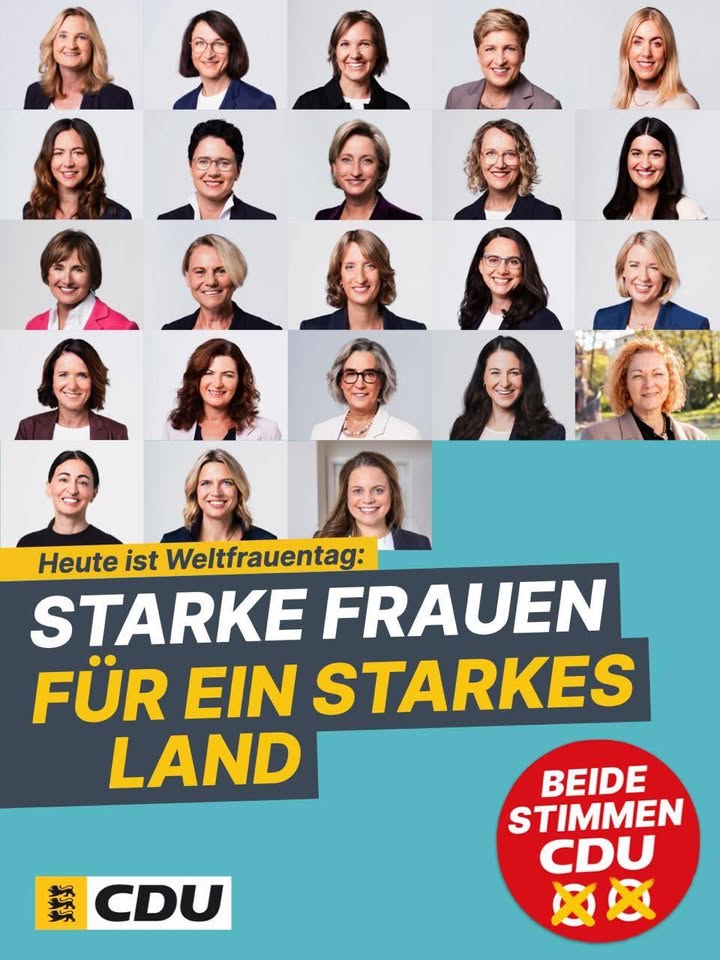 mehrZum Weltfrauentag feiern wir die Frauen, die heute für Baden?Württemberg Verantwortung übernehmen wollen. Unsere Landtagskandidatinnen stehen für Zusammenhalt, Verlässlichkeit und eine Politik, die anpackt.Heute wählen gehen ? gemeinsam Baden?Württemberg stärken - mit beiden Stimmen für die CDU! ❌❌