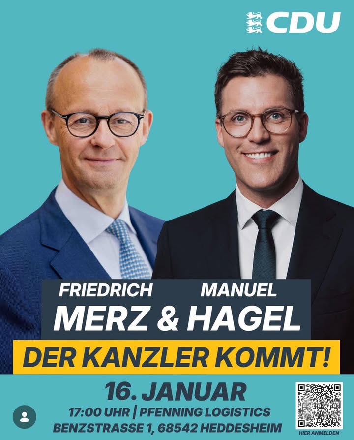 Der Kanzler kommt!CDU-Landtagskandidat Dr. Bastian Schneider bringt Bundeskanzler Friedrich Merz und den Ministerpräsidenten-Kandidaten Manuel Hagel in die RegionAuf Einladung des örtlichen CDU-Landtagskandidaten Dr. Bastian Schneider, der bei uns in Edingen-Neckarhausen wohnt, wird Bundeskanzler Friedrich Merz am Freitag, dem 16. Januar 2026, die Region besuchen. Gemeinsam mit dem Ministerpräsidenten-Kandidaten Manuel Hagel wird Bundeskanzler Merz ab 17 Uhr in Heddesheim reden. Die Bevölkerung ist herzlich eingeladen! Der Einlass beginnt ab 15:30 Uhr. Aufgrund der hohen Sicherheitsvorkehrungen ist eine Anmeldung unter www.bastianschneider.de zwingend erforderlich.Bei der Veranstaltung handelt es sich um den ersten Wahlkampfauftritt eines amtierenden Bundeskanzlers im Rhein-Neckar-Kreis seit Jahrzehnten. Zwar waren Gerhard Schröder im Jahr 2005 und Angela Merkel in den Jahren 2009 und 2017 zu Wahlkampfauftritten in der Region, diese fanden jedoch stets in Heidelberg statt. "Es ist eine große Ehre, dass der Bundeskanzler zu uns in den Rhein-Neckar-Kreis kommt. Das ist ein starkes Zeichen der Unterstützung für unsere ganze Region!" freute sich Landtagskandidat Dr. Bastian Schneider über den hohen Besuch. "So haben auch die Bürgerinnen und Bürger von Edingen-Neckarhausen die Gelegenheit, den Bundeskanzler einmal ganz persönlich zu erleben!"Anmeldungen sind noch bis zum 11. Januar 2026 möglich.